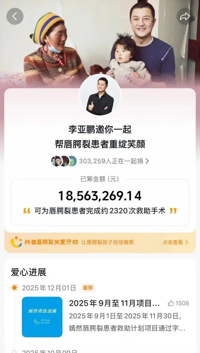 1月14日,李亚鹏发了一条31分钟的视频,名字叫《最后的面对》。镜头里的他,没化妆,没打理头发,满脸的疲惫和憔悴,眼角的皱纹都透着一股子无力。可他没哭,没卖惨,字字句句都透着一股坦诚。他说“法理上,我们就是欠租金了,没啥好说的”,他说“我承认,我的情怀大过了自己的能力”,最戳心的是那句,“我能接受医院关门,但必须把手里的137台手术做完,一个孩子都不能落下”。 视频里还扒出一个细节——为了撑这家医院,他卖掉了北京的四合院、别墅,整整三套房产,砸进去**4000万**!到最后,还要自己扛下**270万**的连带担保责任。看到这儿的时候,多少人鼻子一酸,忍不住红了眼眶。这条视频一出,全网的善意,瞬间被点燃了!可李亚鹏却先给满腔热血的网友们,泼了一盆冷水。他在视频里反复强调,**嫣然天使基金和医院是两个独立机构**,基金有公募资质,医院没有!他苦口婆心地劝大家,理性捐款,别让救孩子的钱,变成了还房租的钱! 即便如此,网友的爱心,还是挡都挡不住啊!**36万多人**,自发地伸出援手,捐款金额噌噌往上涨,很快就超过了**2400万**!去看看捐款留言区吧,全是最朴素的温暖:“50块不多,给孩子买颗糖,也希望能帮医院撑一天”“不是帮李亚鹏还债,是想让那些爱笑的孩子,能继续有地方治病”“我家娃就是嫣然救的,现在能跑能跳能喊妈,这份恩,必须报”。 李亚鹏的直播间,更是直接