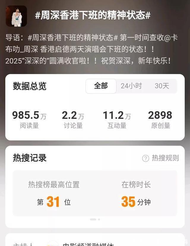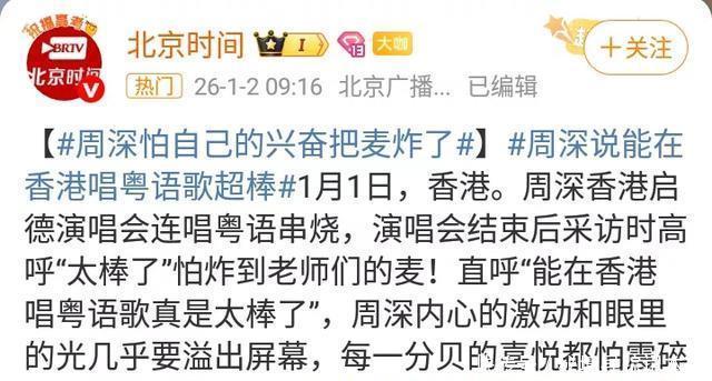 歌手周深在演唱会现场深情演唱,用歌声温暖和治愈众多香港歌迷的心灵! 北京时间媒体在社交平台发文,好评歌手周深的粤语演唱! 清晰可见的是,在香港启德演唱会现场,歌手周深连唱粤语歌曲,引发众多观众共鸣! 香港媒体发文,见证歌手周深2025巡回演唱会香港跨年纪念场圆满收官! 所以,歌手周深在香港演唱会演出,有很多成功的见证,以及难忘的瞬间! 这不,周深香港演唱会演出高清图一一公开,证明歌手周深当时的演出状态究竟有多好! 这一张张精美的演出照,定格了周深举手投足的帅气一幕! 那一张演出照,见证了歌手周深演出服饰的美好所在! 看这一张演出照,定格了歌手周深在舞台演出,手拿话筒,面对万千舞台观众手舞足蹈精彩的一幕! 而这一张演出照,彰显了歌手周深自信、愉快、欣喜的舞台演出心境! 引人关注的是,这一张演出照,便是歌手周深微笑示人的美好形象! 他的脸上,总是笑容满面,充满新年的喜庆与欢快!与元旦节日的氛围相呼应! 再来看这一张演出宣传照,那是歌手周深和宣传海报一起合体同框的照片。 真人和海报的人物近距离接触,好新颖好温暖好感人! 因此,周深香港演唱会就是如此美好。 周深说香港演唱会会像梦一样消息,冲上热搜,引发众多网友关注! 这一话题阅读量达到131.9万,互动量2.2万,讨论量5455。 一时间,周深在香港演唱会演出,成为内地歌手新的突破! 周深香港舞台演出照,定格了90后歌手最美好的风采! 时间已经从2025年,进入到2026年! 歌手周深追梦,还在新的路上!